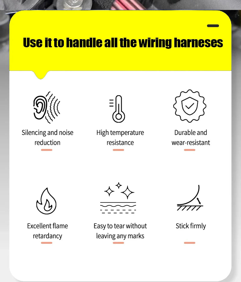 The thickness, tensile strength and appearance of this engine tape is similar to, if not better than, the original harness tape. The super-sticky adhesive allows users to quickly bundle hard-to-reach cables.